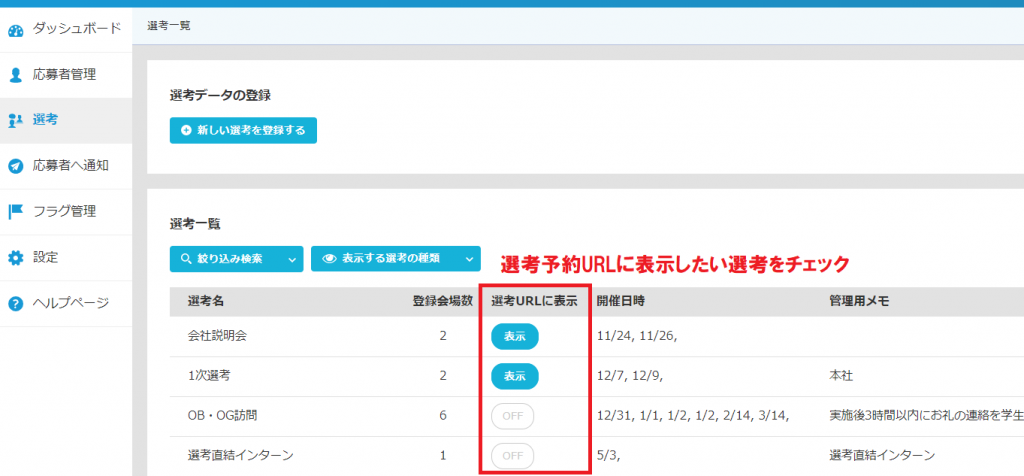 ②選考一覧から選考一覧URLに選択肢として表示したい選考を「表示」に変更する