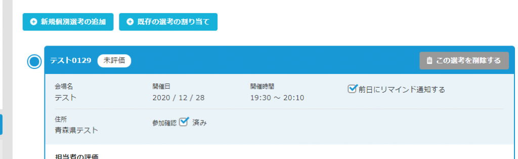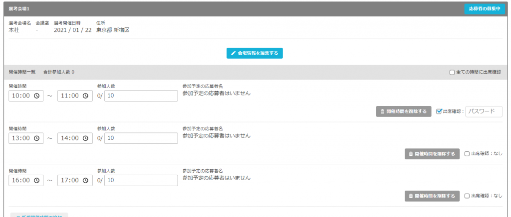 選考詳細画面で参加確認機能を付けたい会場を選んで編集をします。