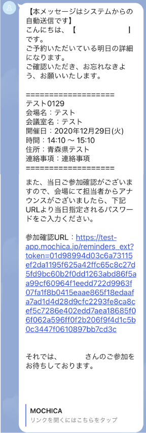 前日のリマインドメッセージに参加確認用URLが添付されます。