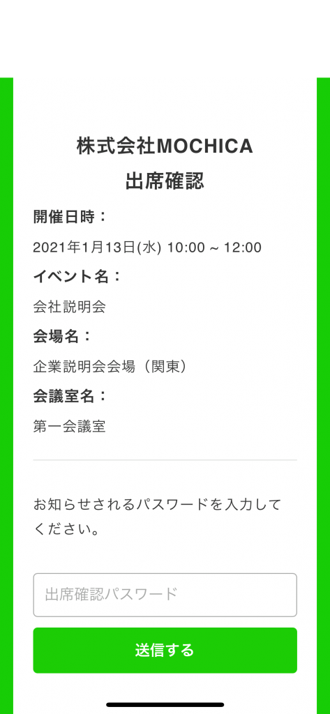 応募者側がパスワード入力完了すると、参加確認が取得できます。