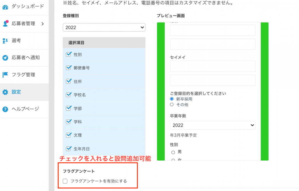 ※既存の機能である「フラグアンケート」をエントリーフォーム上でも設定ができるという内容です。