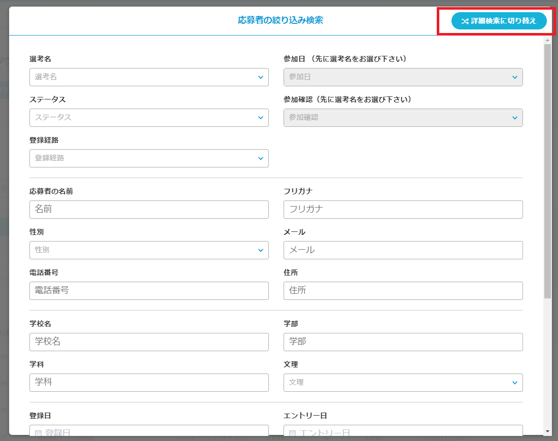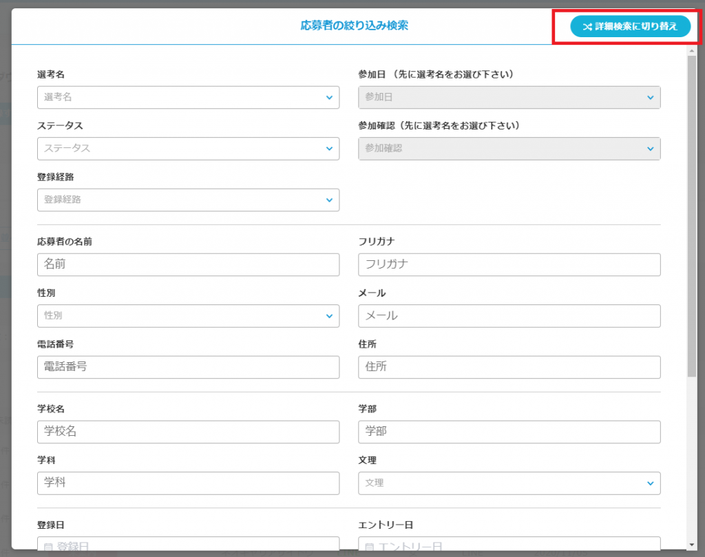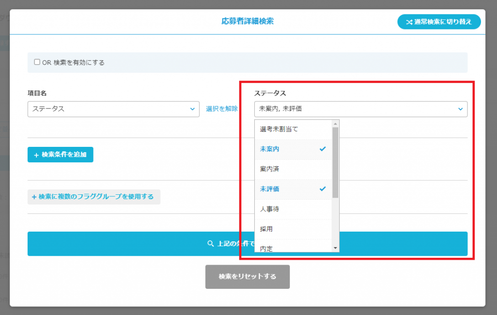 応募者一覧の検索メニューから「詳細検索」に切り替えることができます。その中における「ステータス」選択において