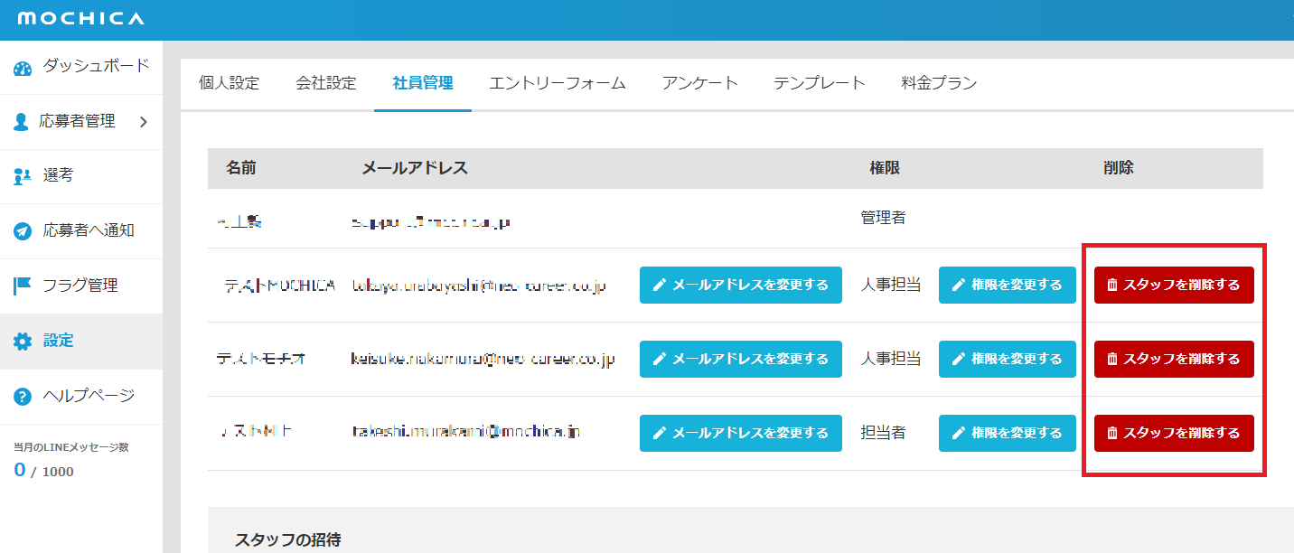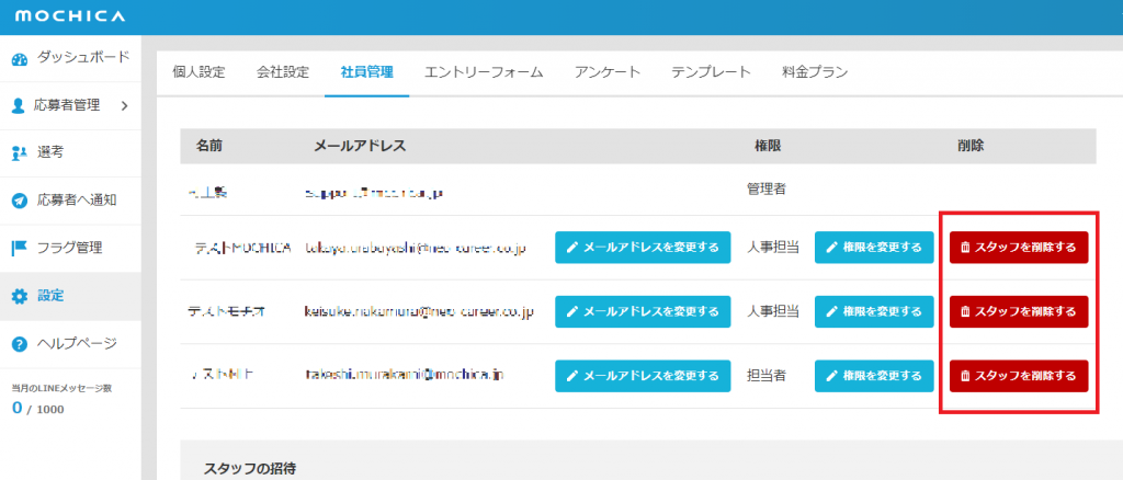 「設定」メニュー内の「社員管理」にて、発行済みの社員アカウントを削除することができます。