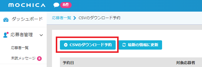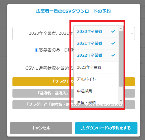 これまで応募者データをCSVでダウンロードする際、全卒年/種別が選択された状態で