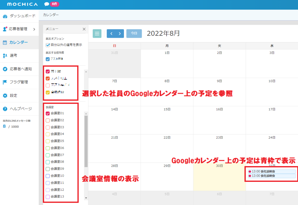 MOCHICAのカレンダー上にGoogleの予定や、社内の会議室の予定を
