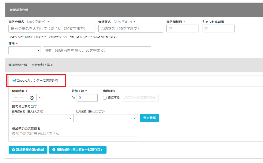 選考作成の際に、時間単位でGoogleカレンダー連携の選択をすることができます。