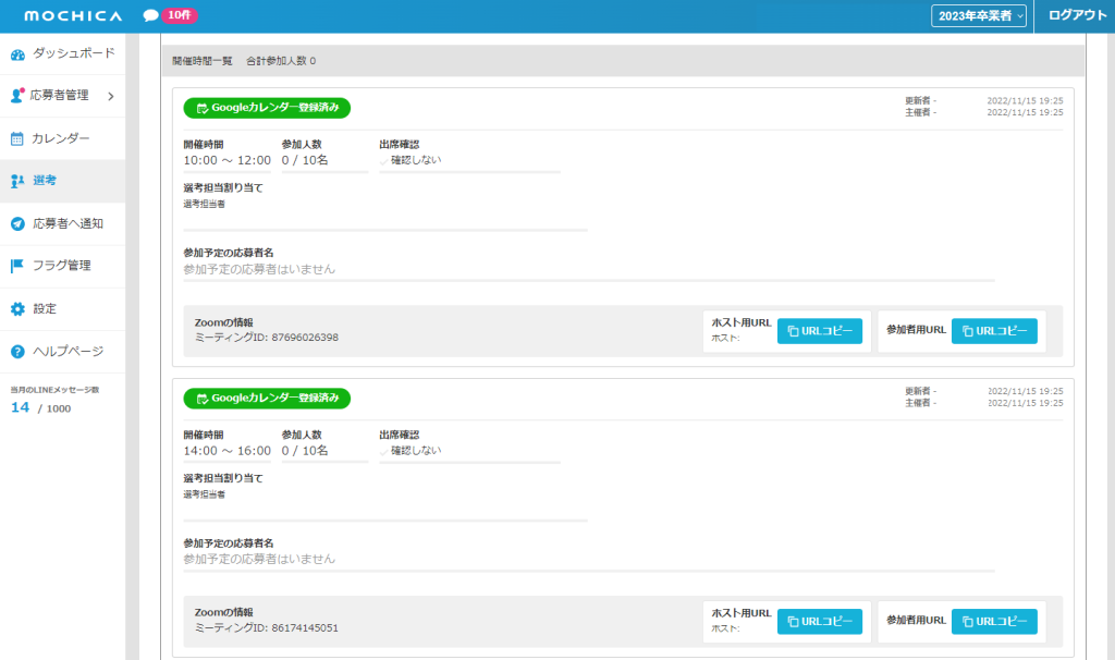 選考作成時に自動的に社内のZOOMアカウントからMTGのURLを生成して