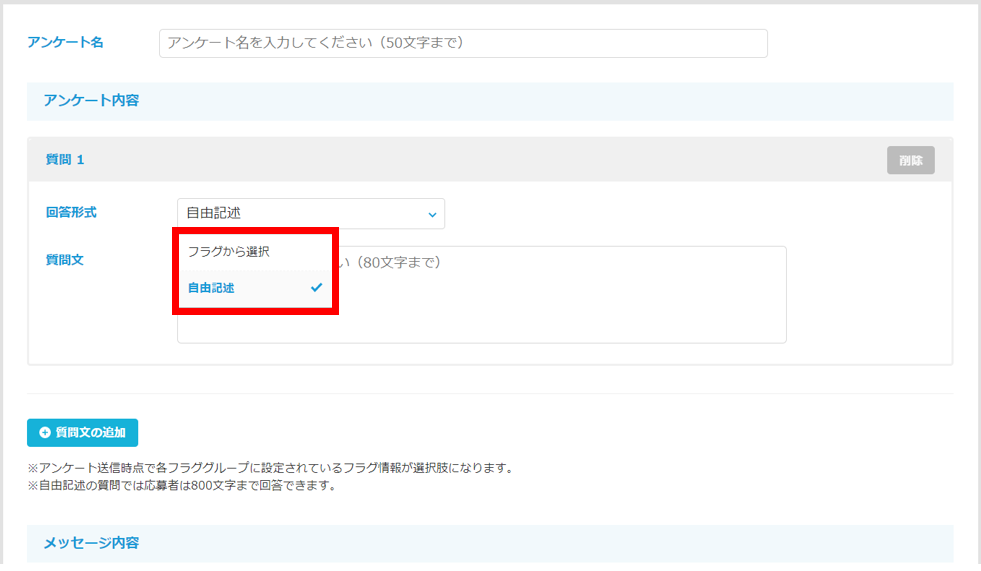 回答形式を「フラグ」、「記述式」でお選びいただけます。