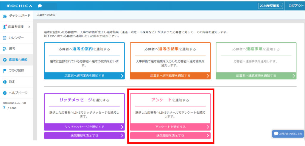 ①「応募者へ通知」画面の「アンケートを通知する」画面に入ります。