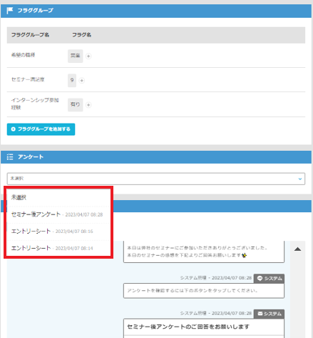 「未選択」ボタンをクリックすると、これまで応募者に送付したアンケートが出てきます。