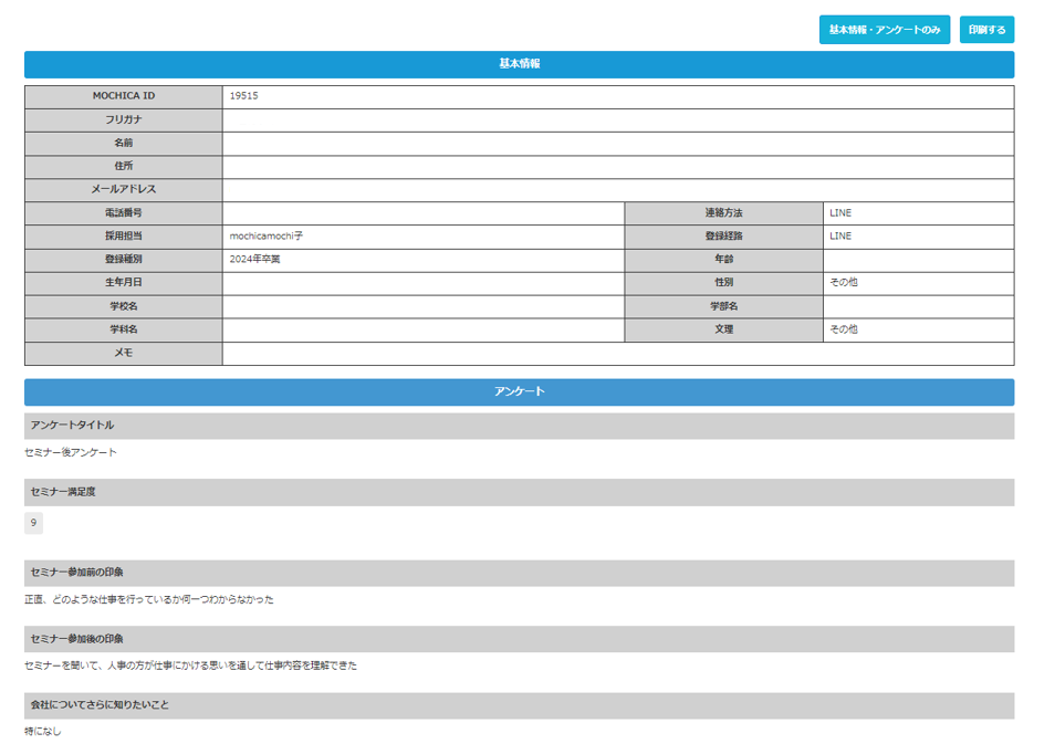 応募者の個人情報とアンケート情報のみ印刷できます。