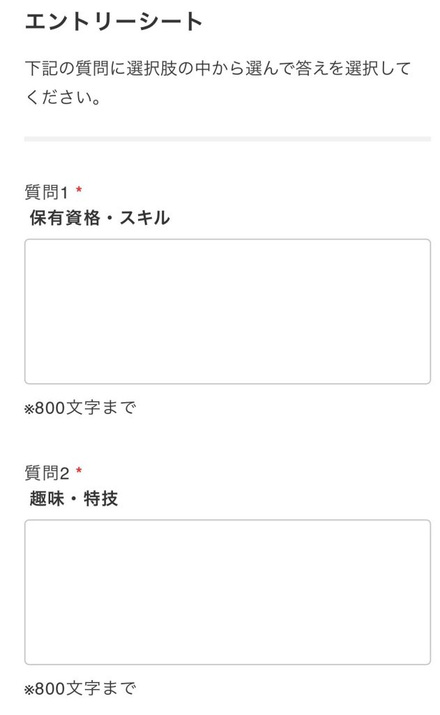 質問文の最大の文字数は80文字、記述式の応募者の回答文字数は最大800文字までです。