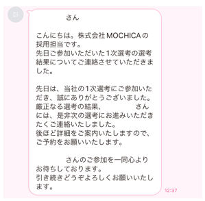 また、応募者側は結果を確認する際、トーク画面から結果確認ボタンをタップすると下記ページに遷移し、