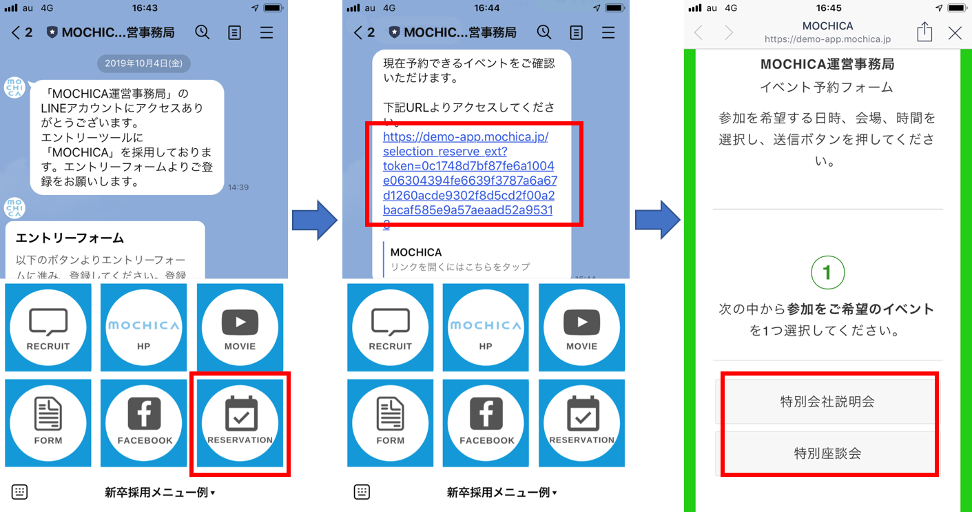 例えば、リッチメニューに『選考予約』『RESERVATION』といったボタンを作っていただき、
