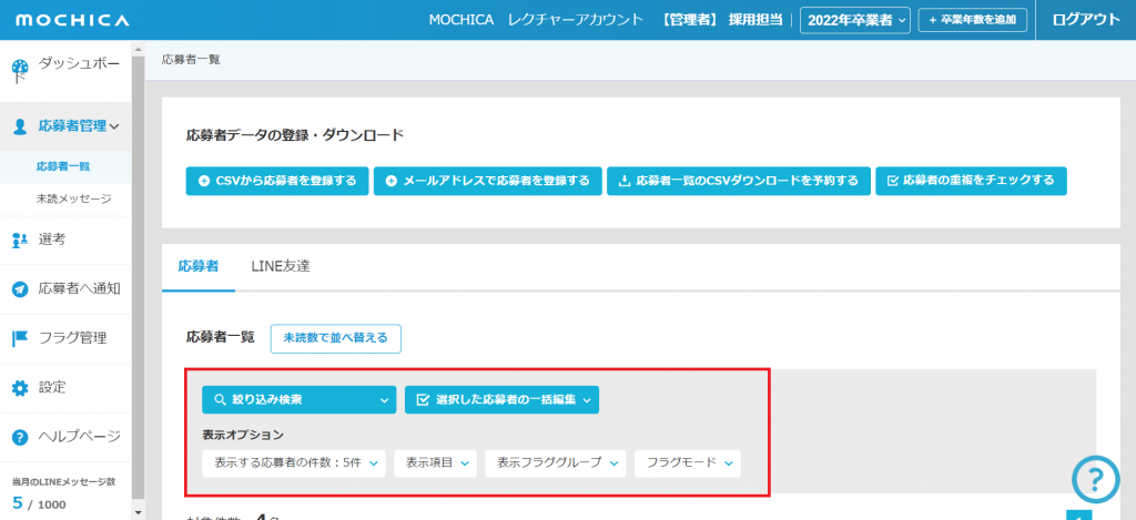・表示する応募者の件数;1ページに表示する学生数を変更することができます。(5件/25件/50件/100件/200件)