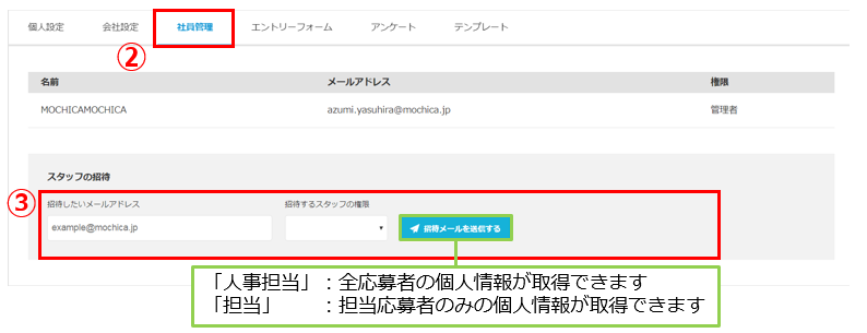 ③「スタッフの招待」から登録したいメールアドレスと権限を入力