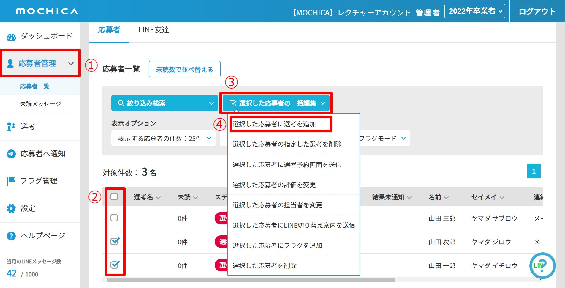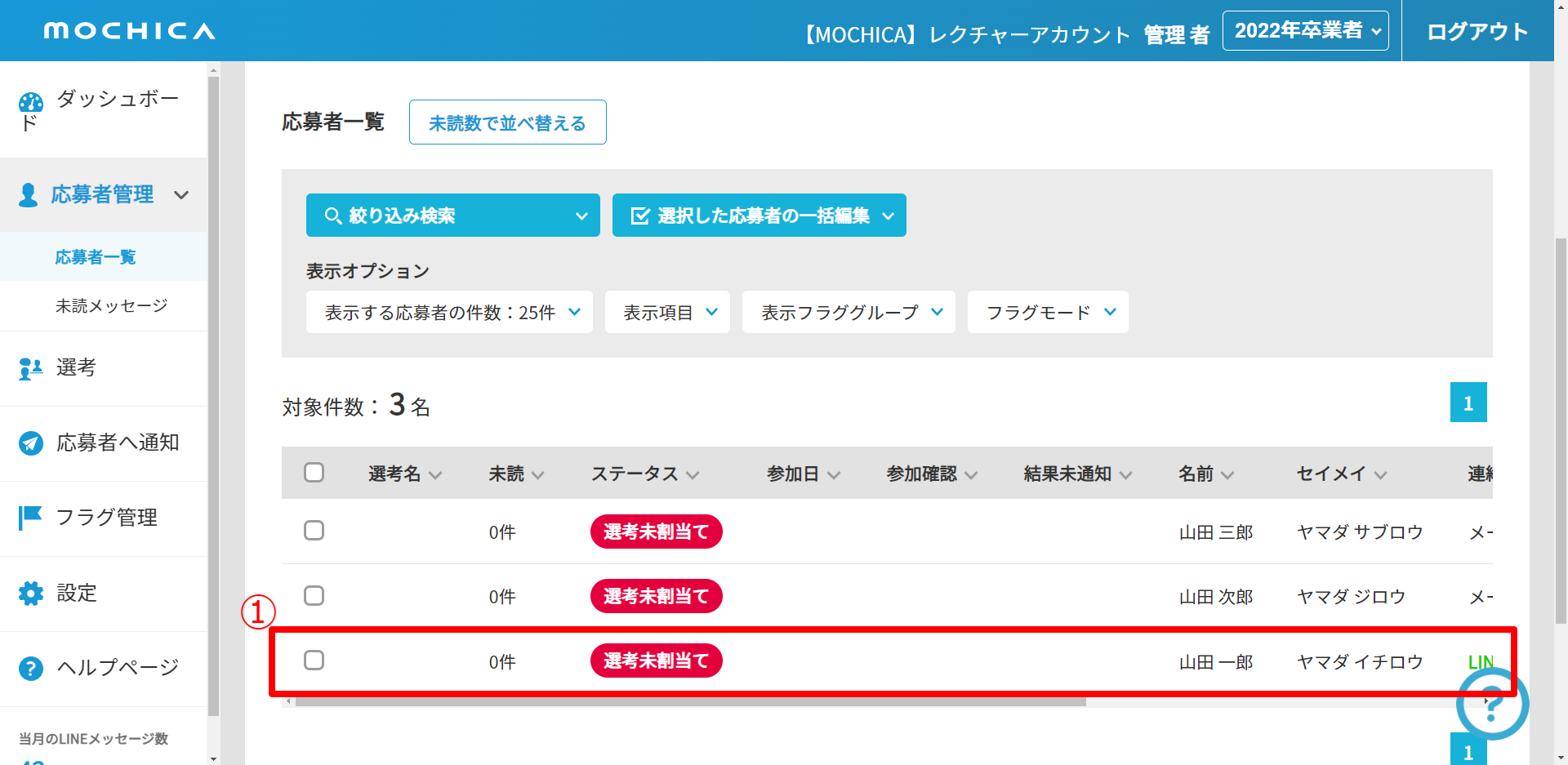 ② 選考を割り当てたい応募者をチェックボックスで選択