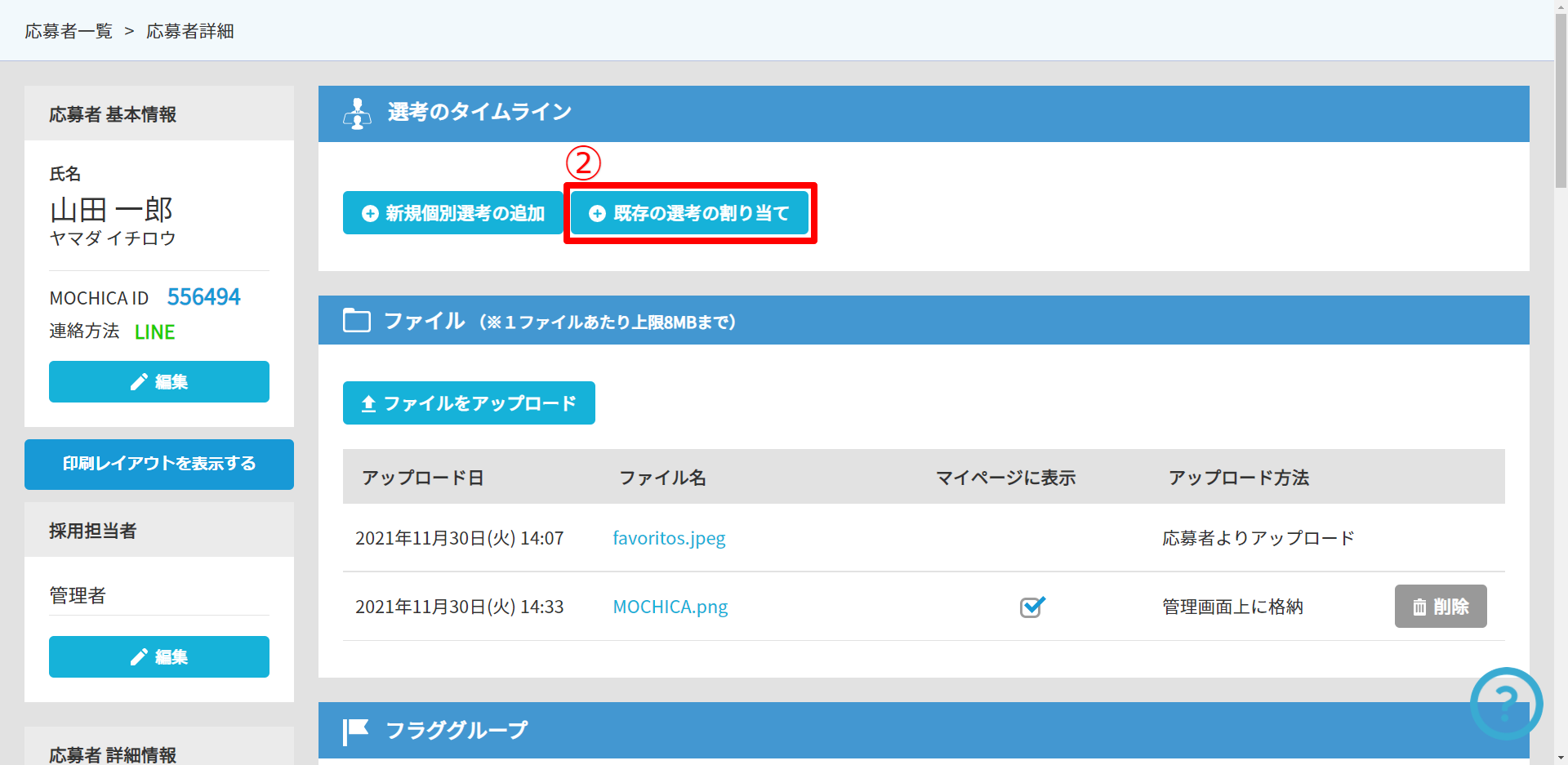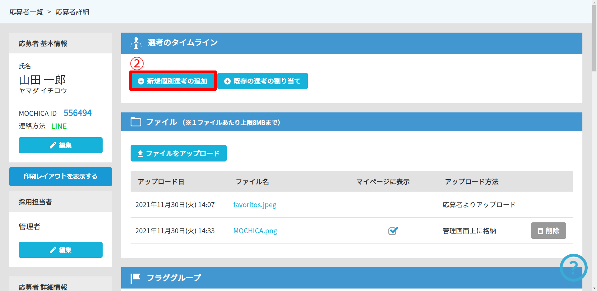 ① 選考を追加したい応募者をクリックし、応募者詳細を開く