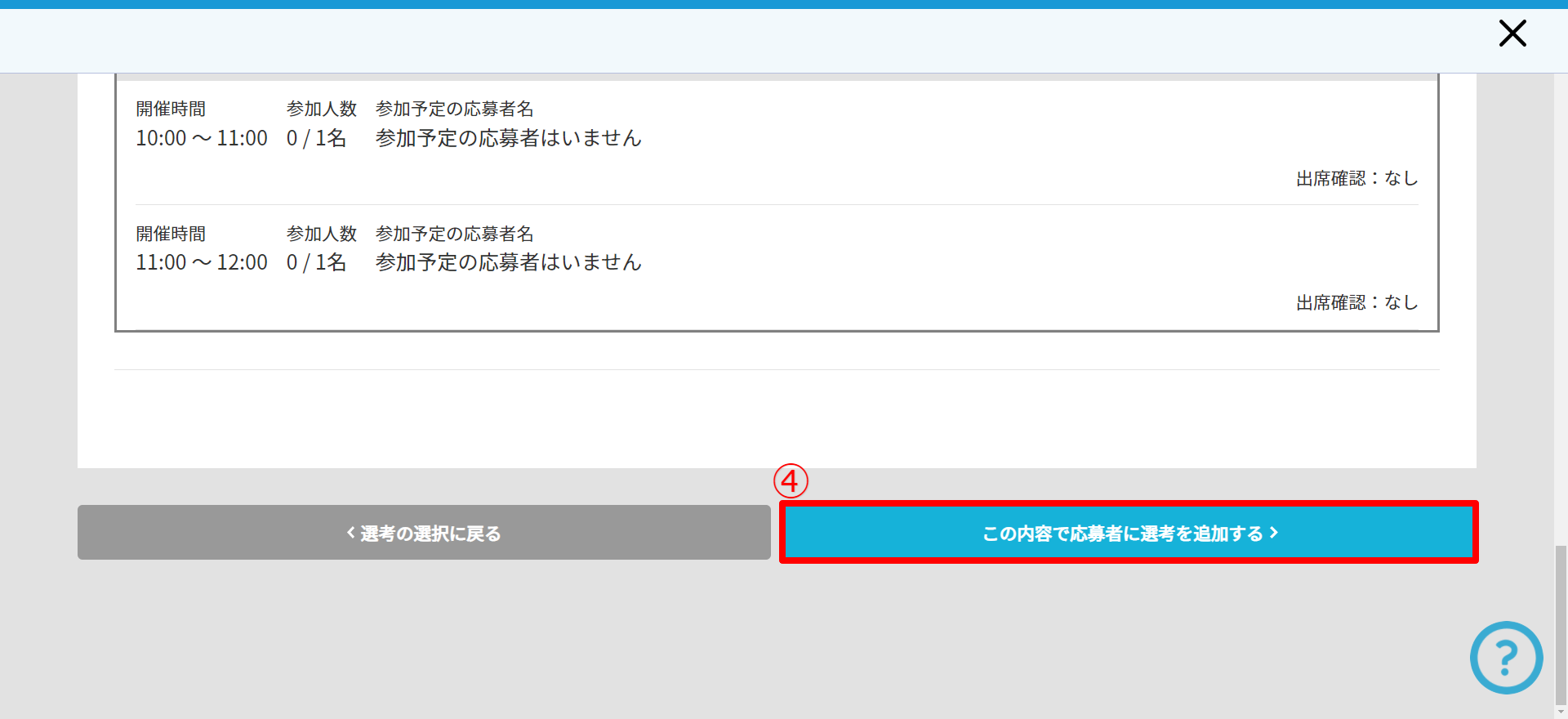 ④ 内容を確認に、誤りがなければ「この内容で応募者に選考を追加する」をクリック。