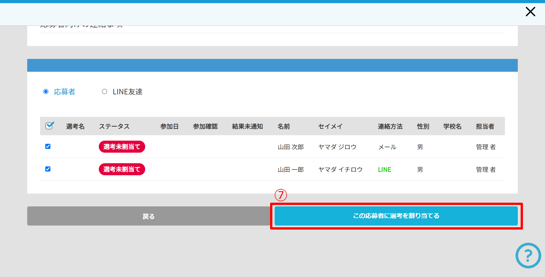 ⑦ 応募者を確認し「この応募者に選考を割り当てる」をクリック