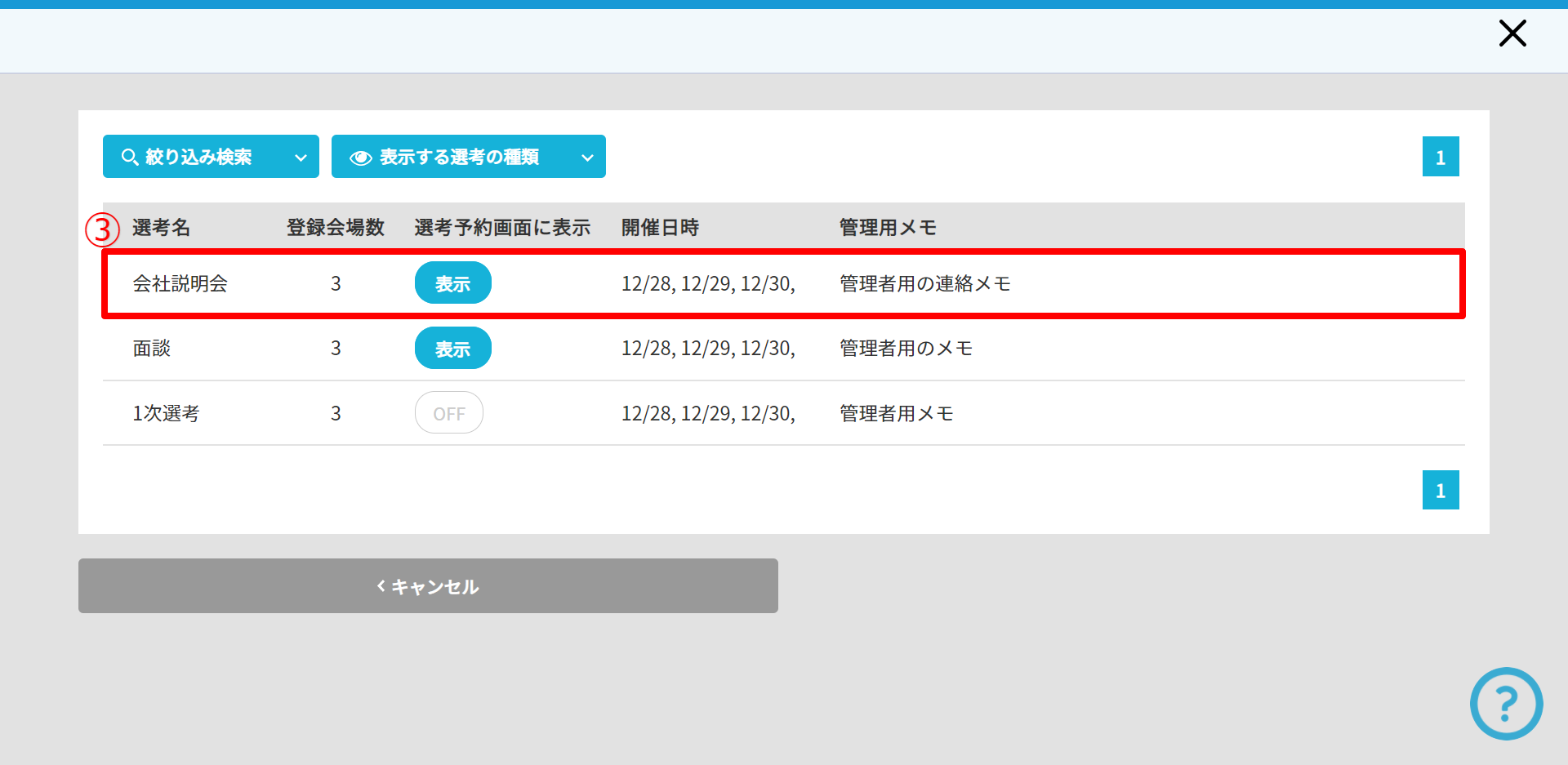 使用例:この選考の日程の中から選考の予約をしてほしい/個別のやり取りで次回の選考が決定している場合 etc…