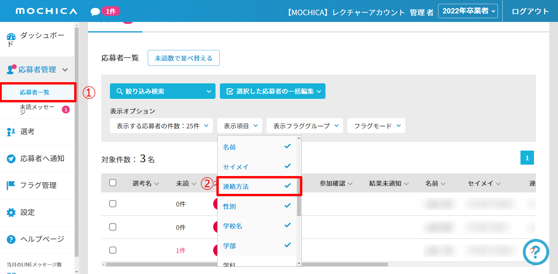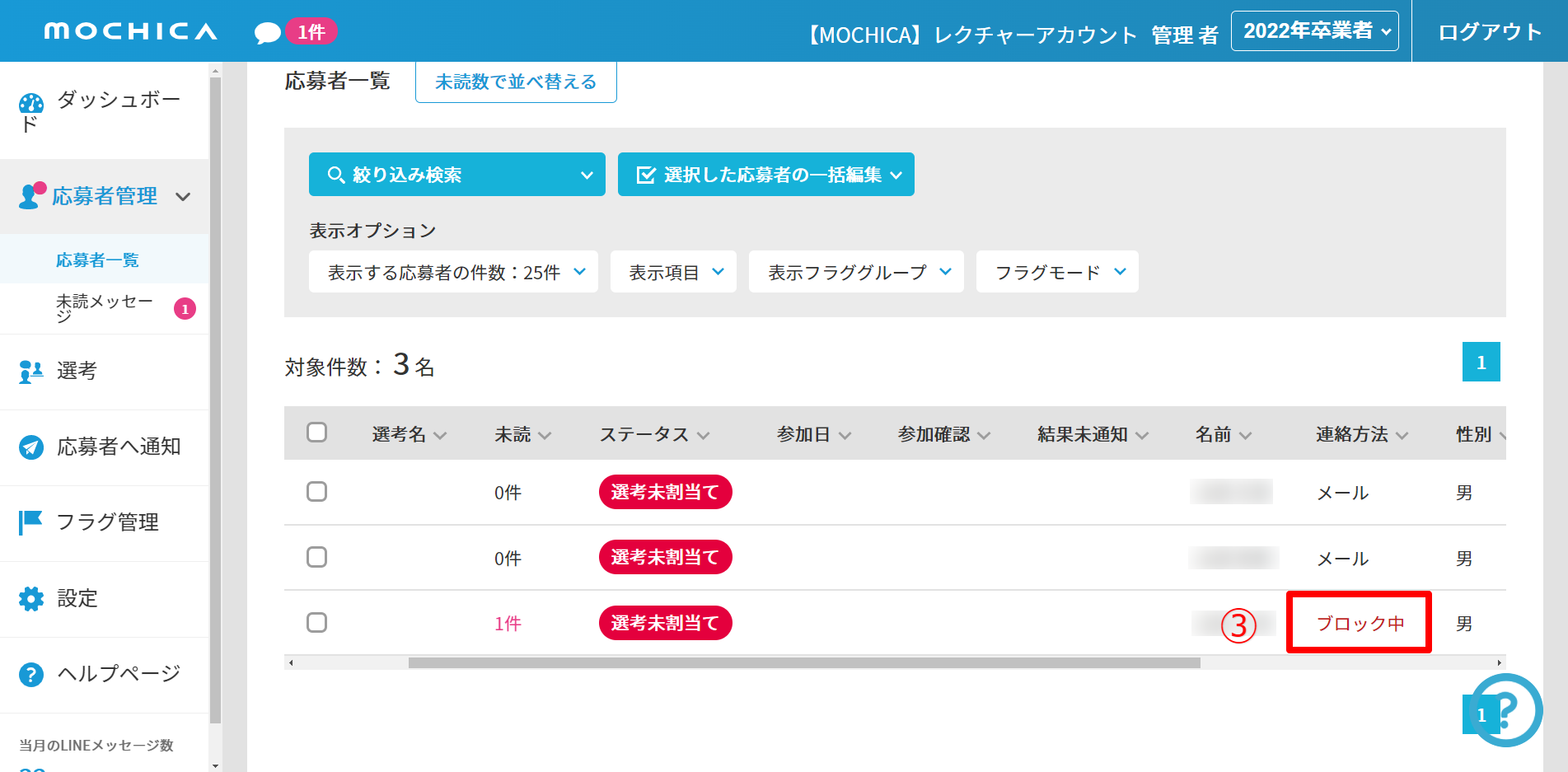 ③ 応募者一覧の「連絡方法」欄にてブロックの有無を確認が出来ます。