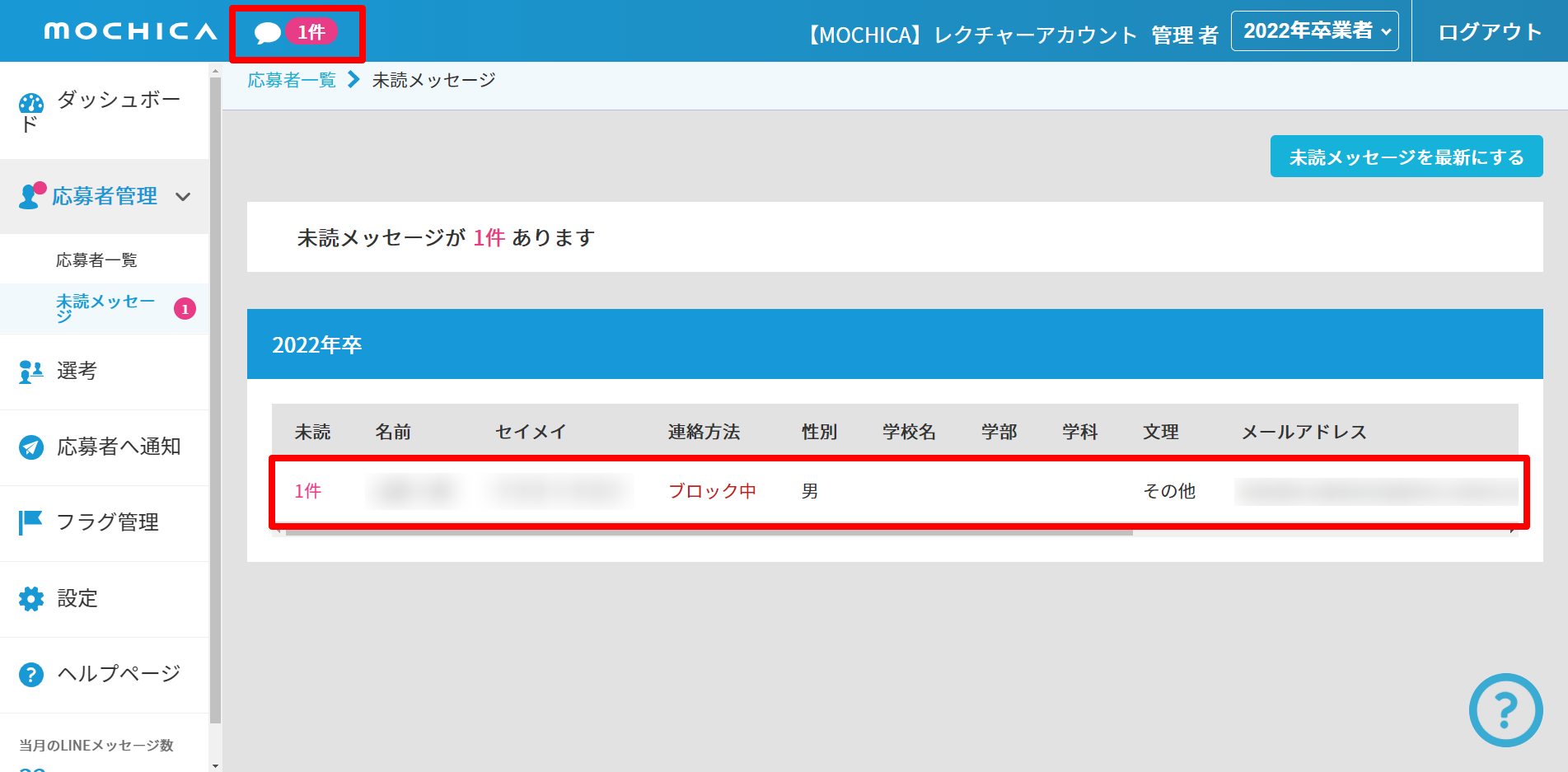 ① 画面左側の「応募者管理」内にある「未読メッセージ」もしくは画面上部の吹き出しをクリック。