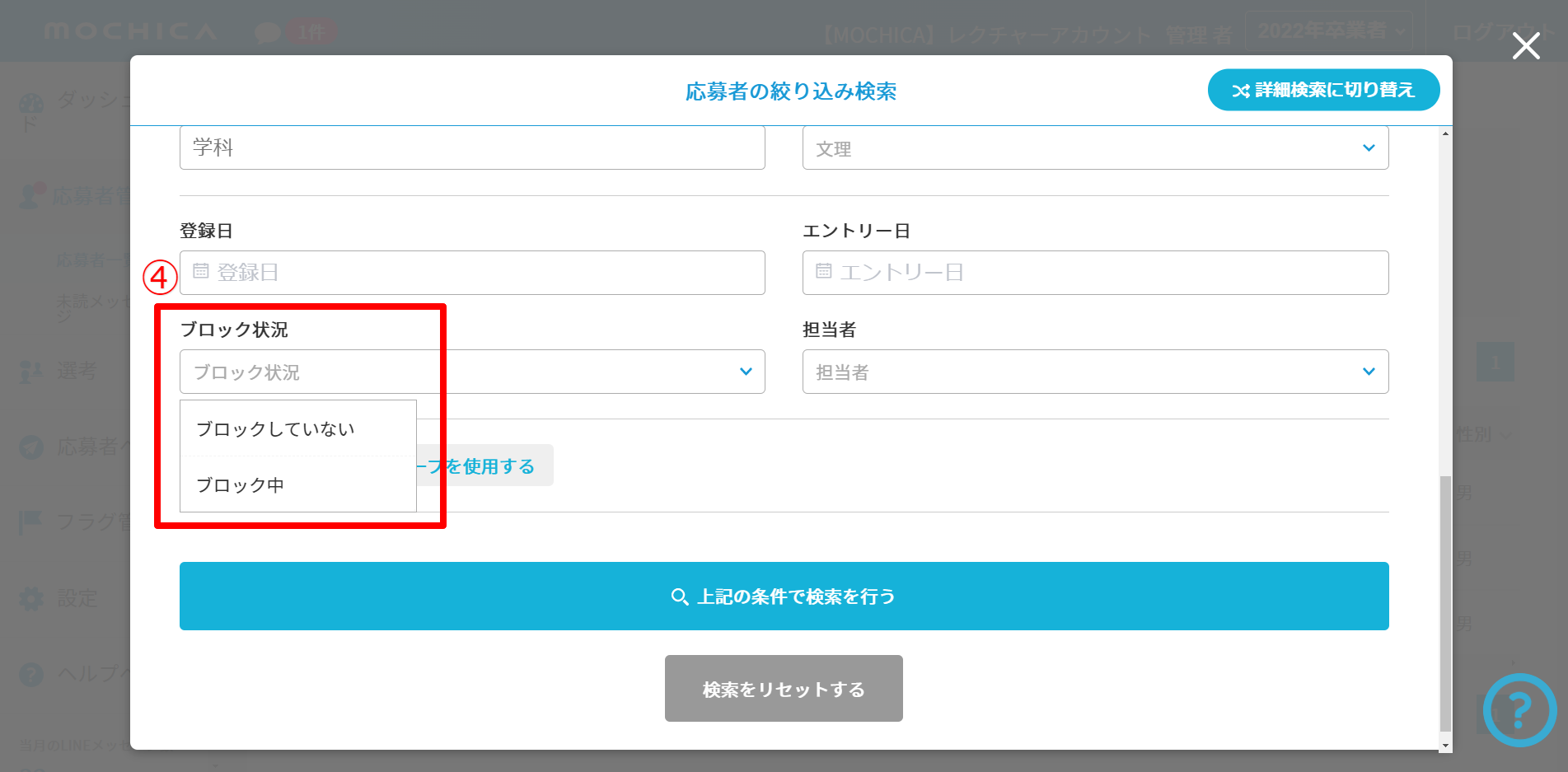 ④ 絞込検索にてブロック中の学生を表示/除外することも出来ます。
