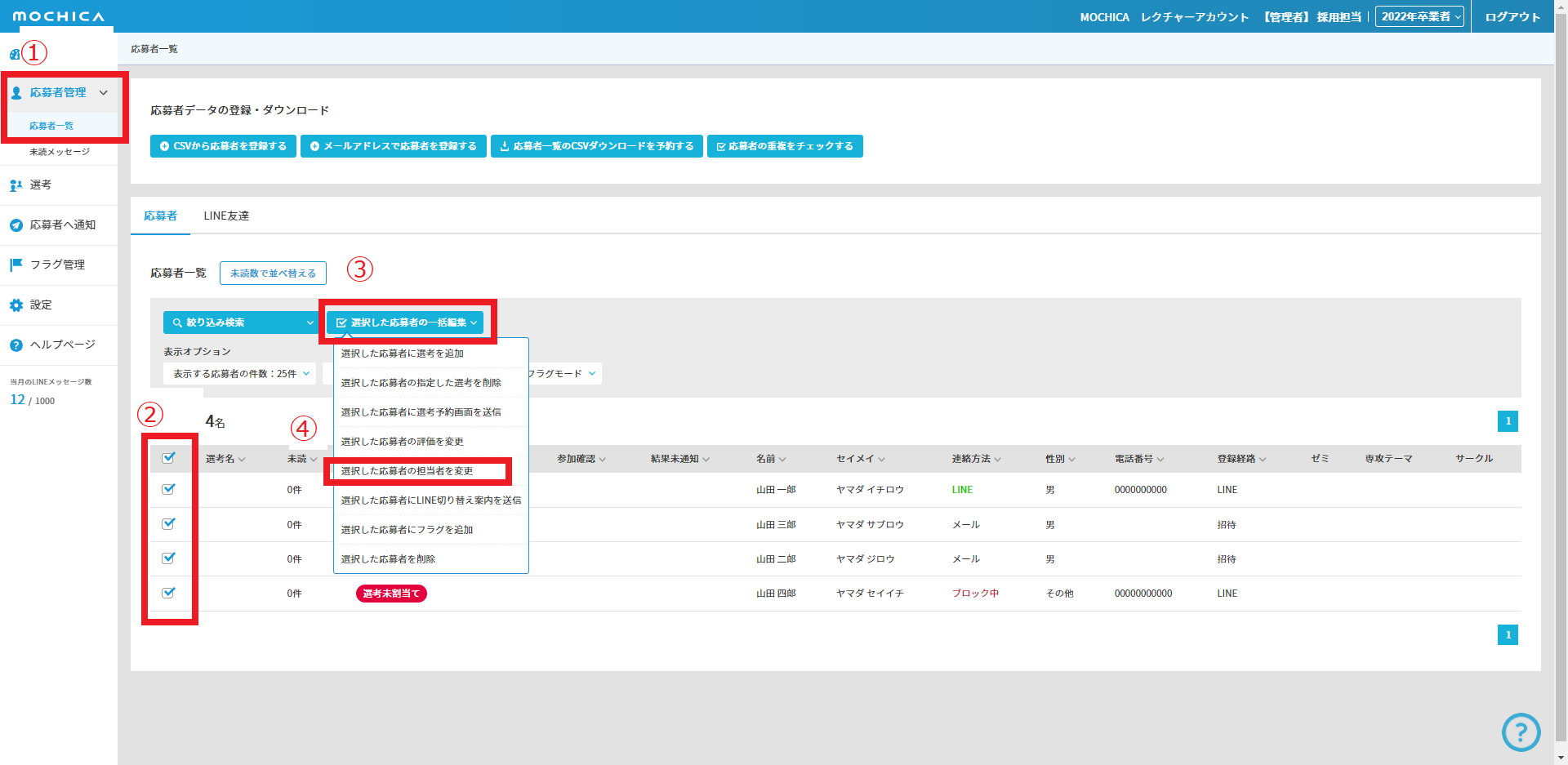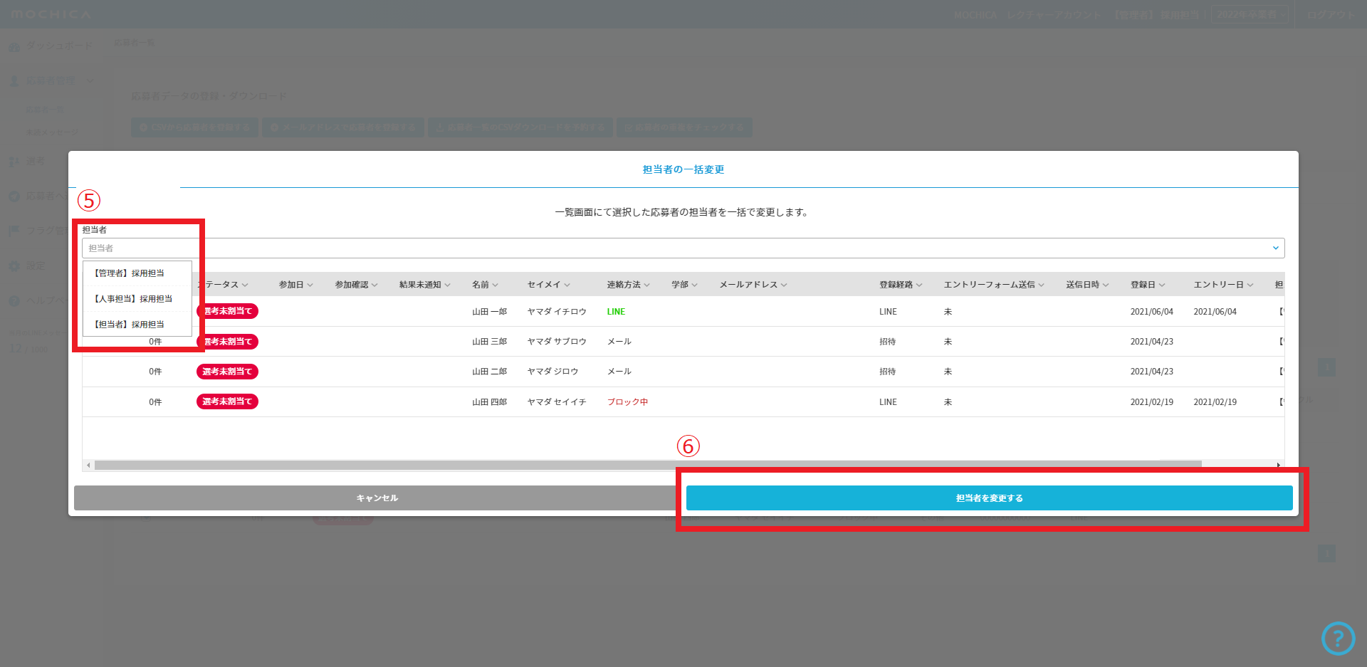 ④ 「選択した応募者の担当者を変更」をクリック