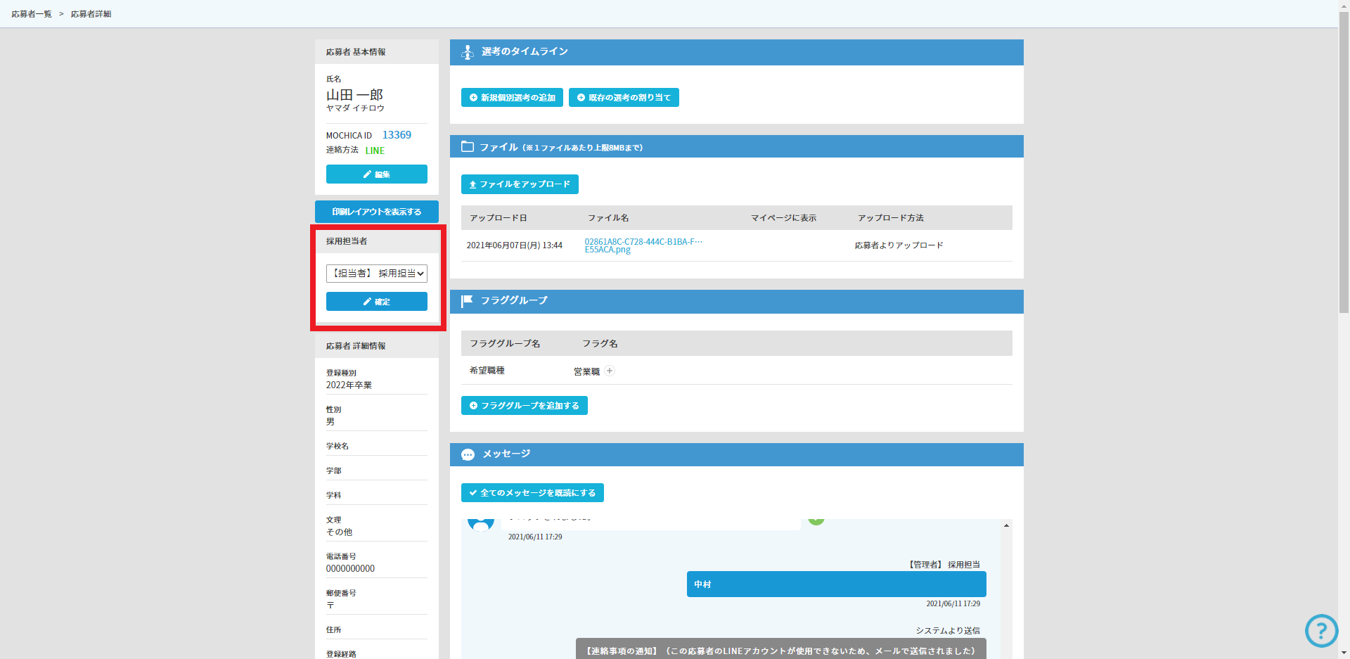 担当者を変更したい学生の個人ページにて「採用担当者」の項目を確認。
