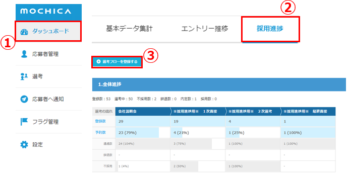 ※注意※ダッシュボードの進捗表を使う場合、事前に「選考」を作成していただく必要があります