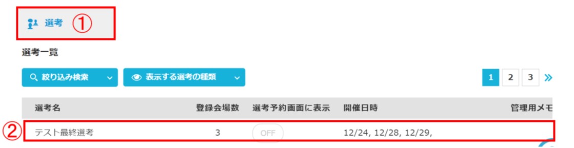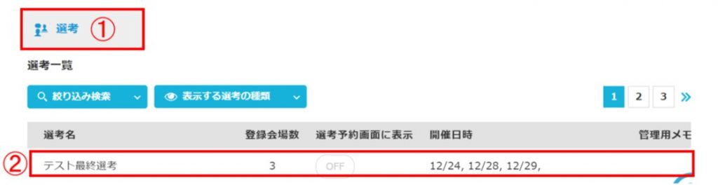 ➀「選考」をクリック