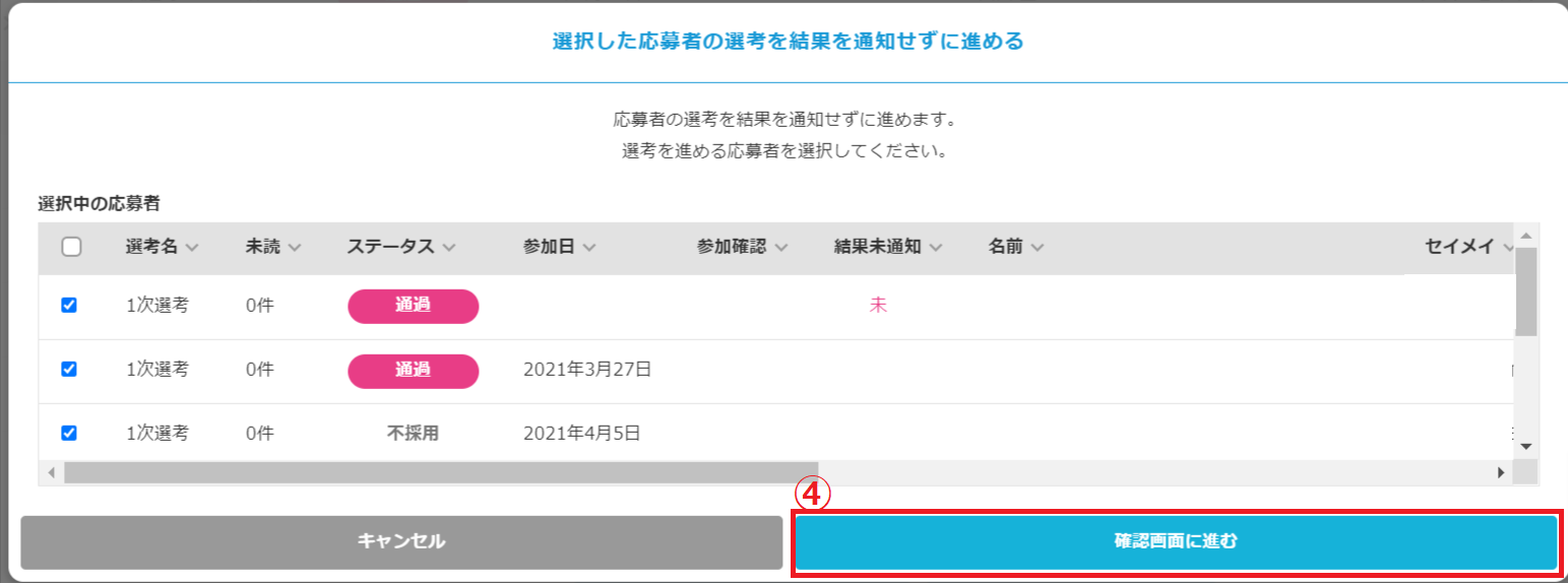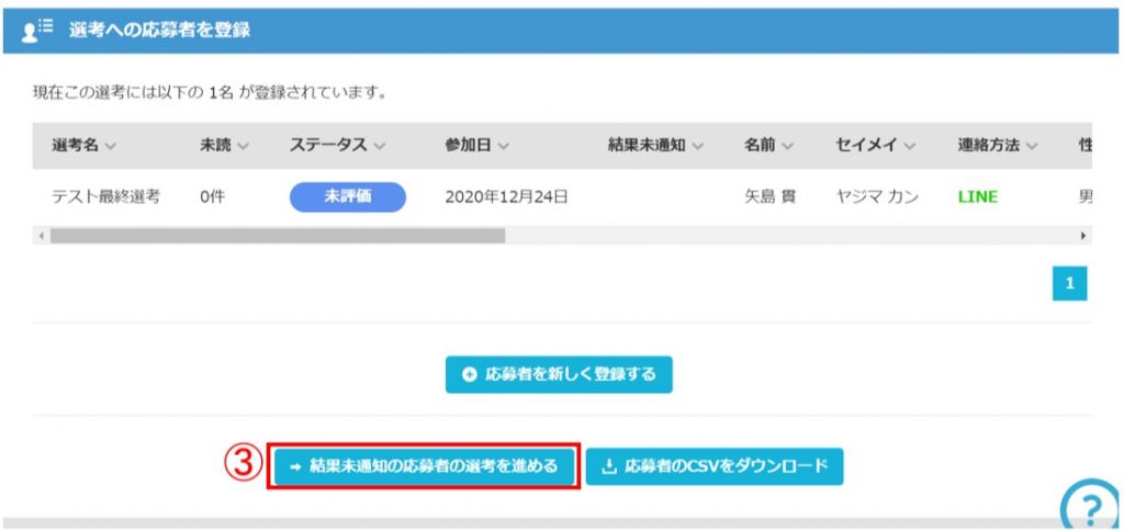 ③「選考へ応募者を登録」の「結果未通知の応募者の選考を進める」をクリック