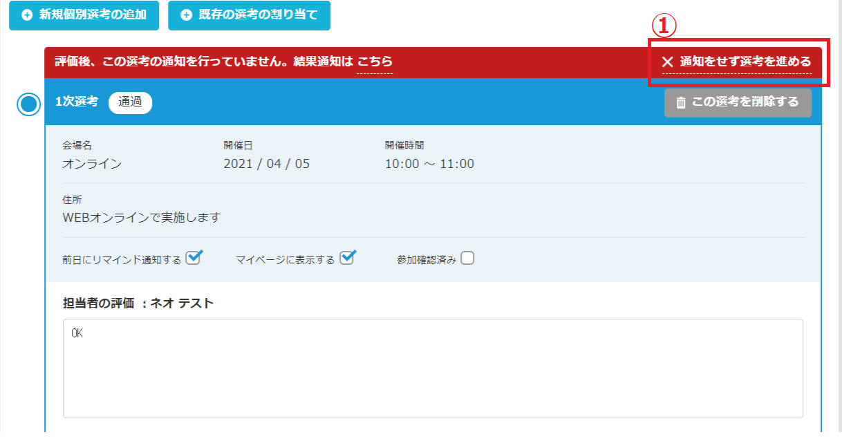 選考結果を通知せず、次の選考の割り当てを進めることができます。