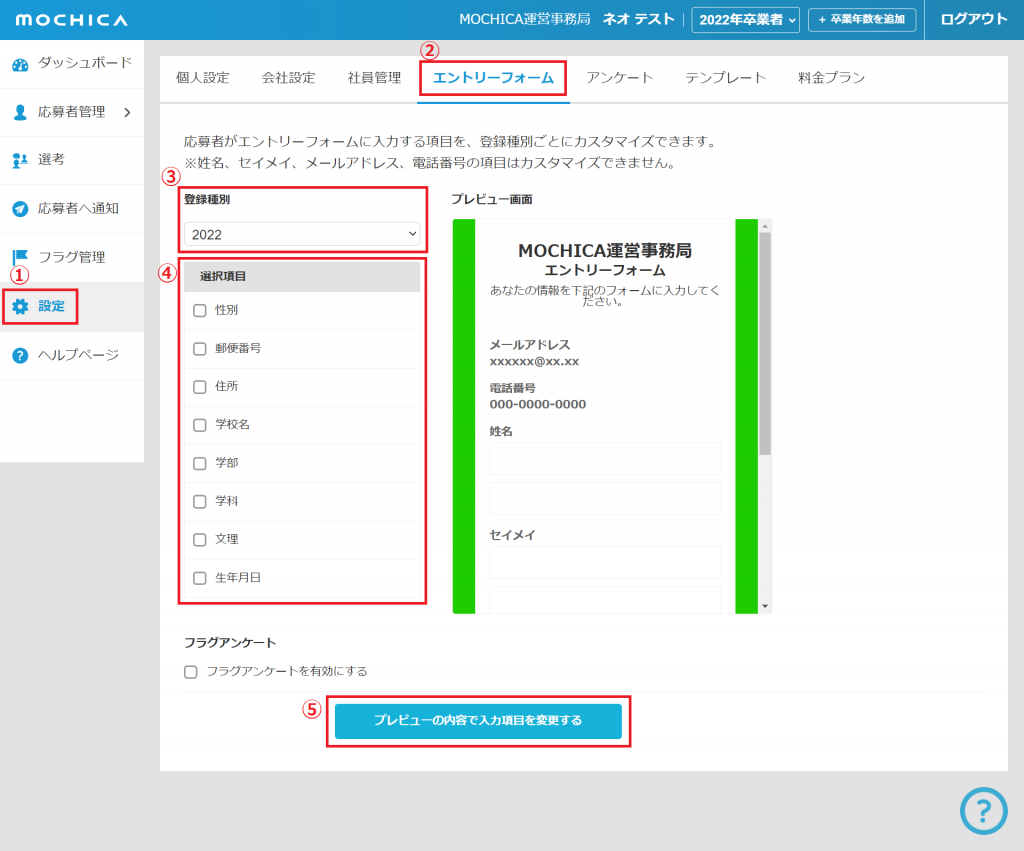 注意1:「登録種別」ごとにエントリーフォームを設定して頂く必要がございます。