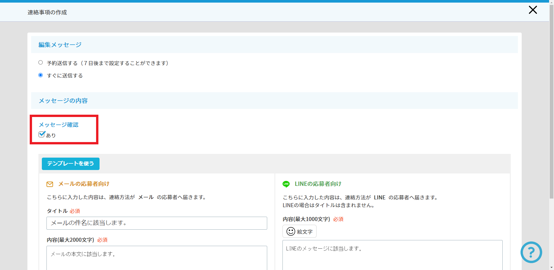 応募者に送信するメッセージに、送信確認用のURLを添付することができます。