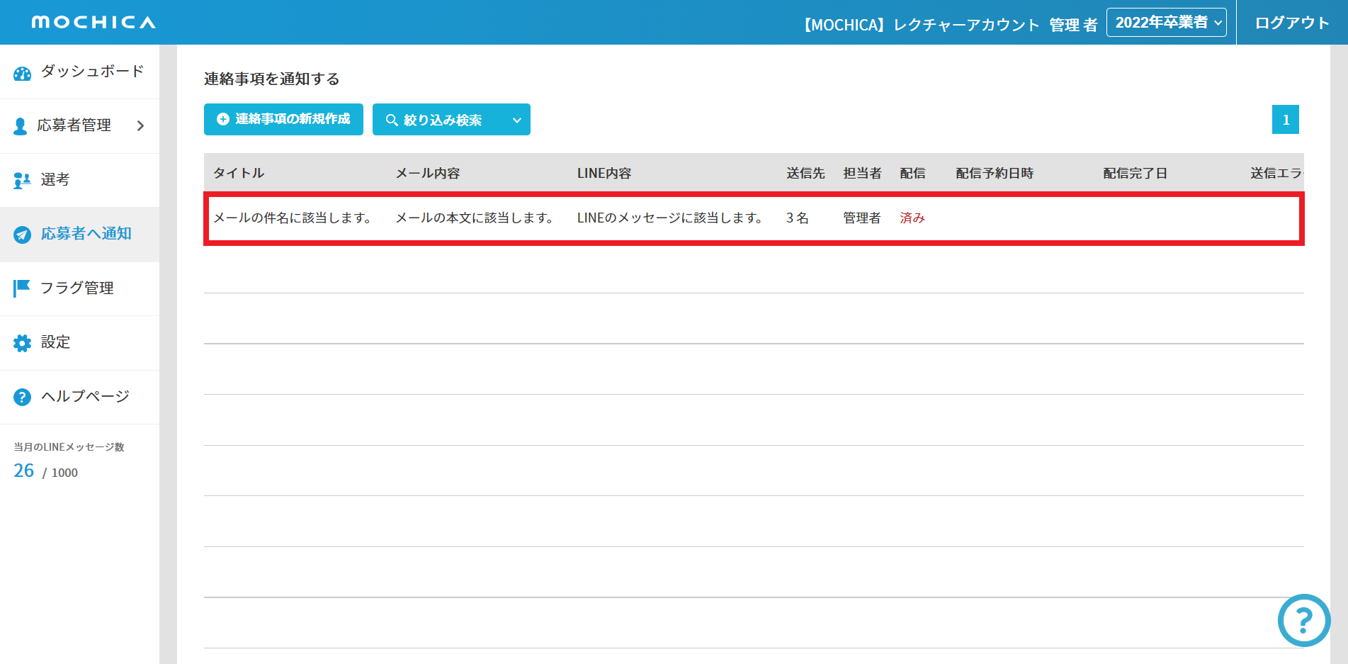④ 応募者へ通知>応募者に連絡事項を通知する から、確認したい送付済みメッセージの行をクリック。