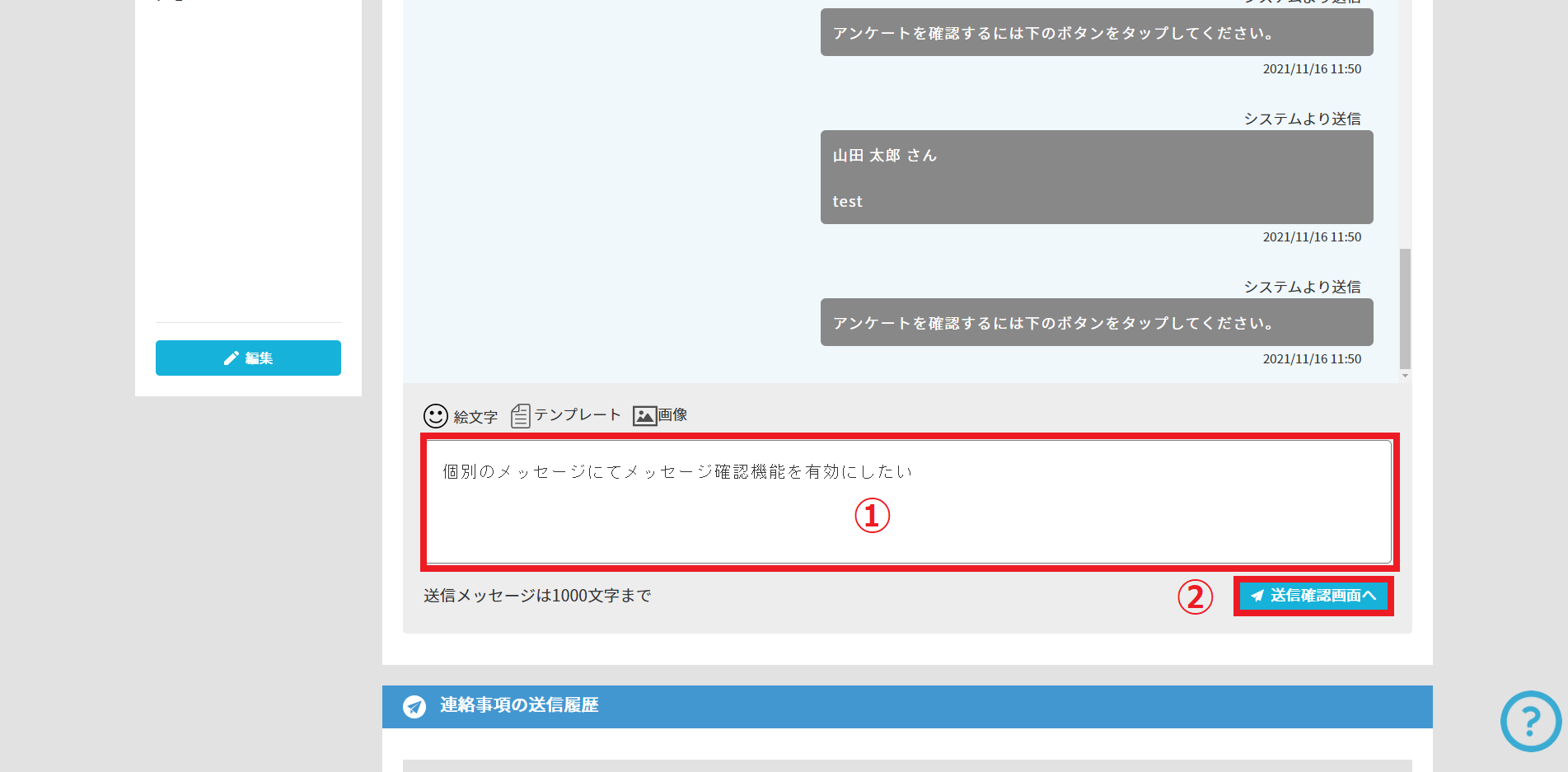 ⑥ メッセージ送信履歴のページ下部から確認状態を確認することができます。