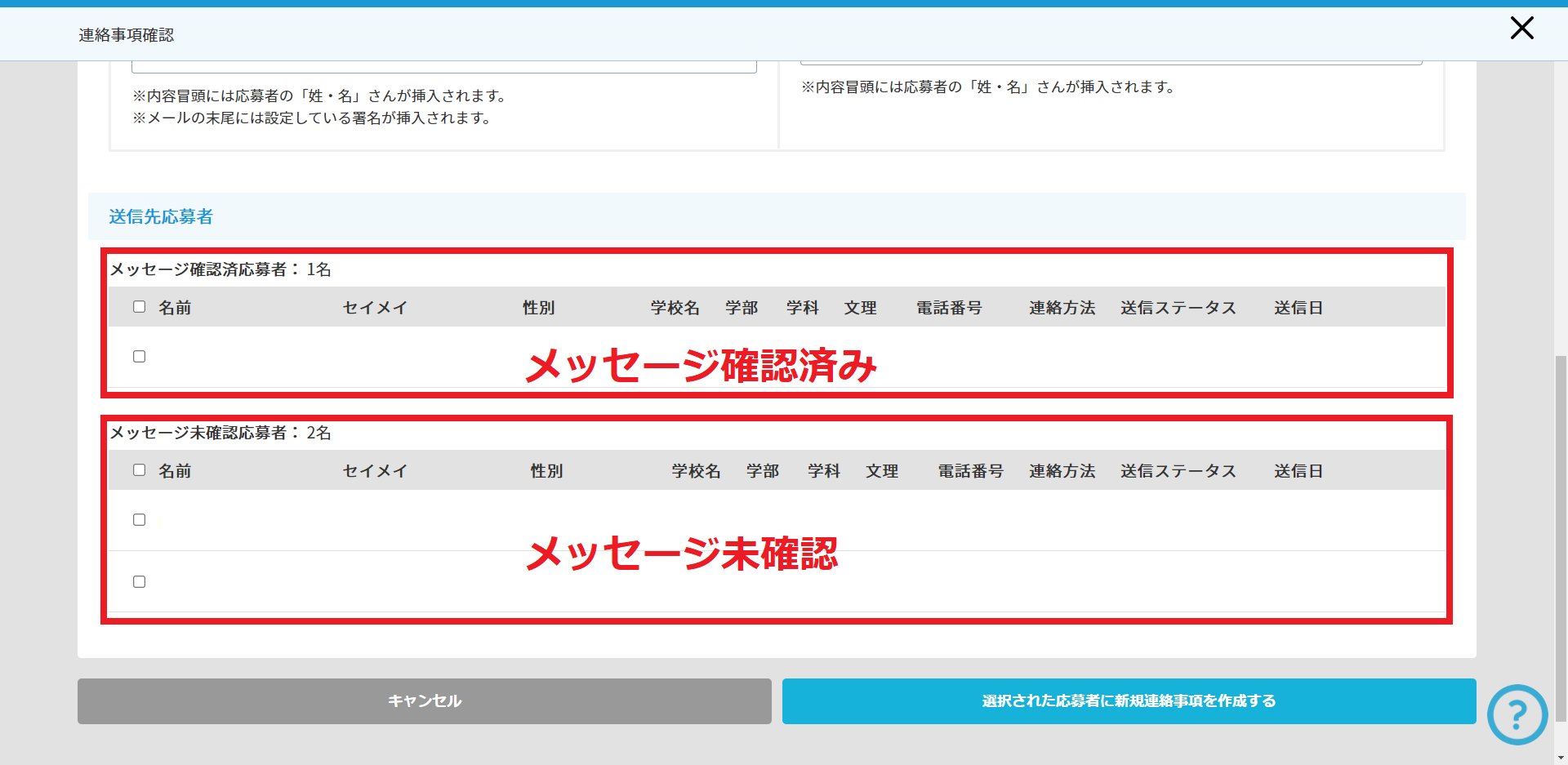 メッセージ履歴ページ下部にて「メッセージ確認済み応募者」と「メッセージ未確認応募者」に分かれて表示されます。