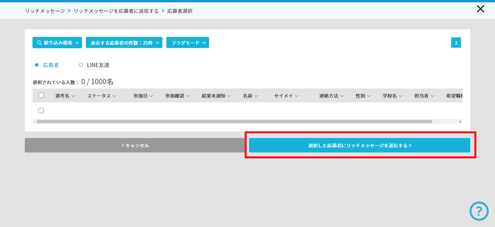 ③ 送信したい応募者を選択肢、「選択した応募者にリッチメッセージを送信する」