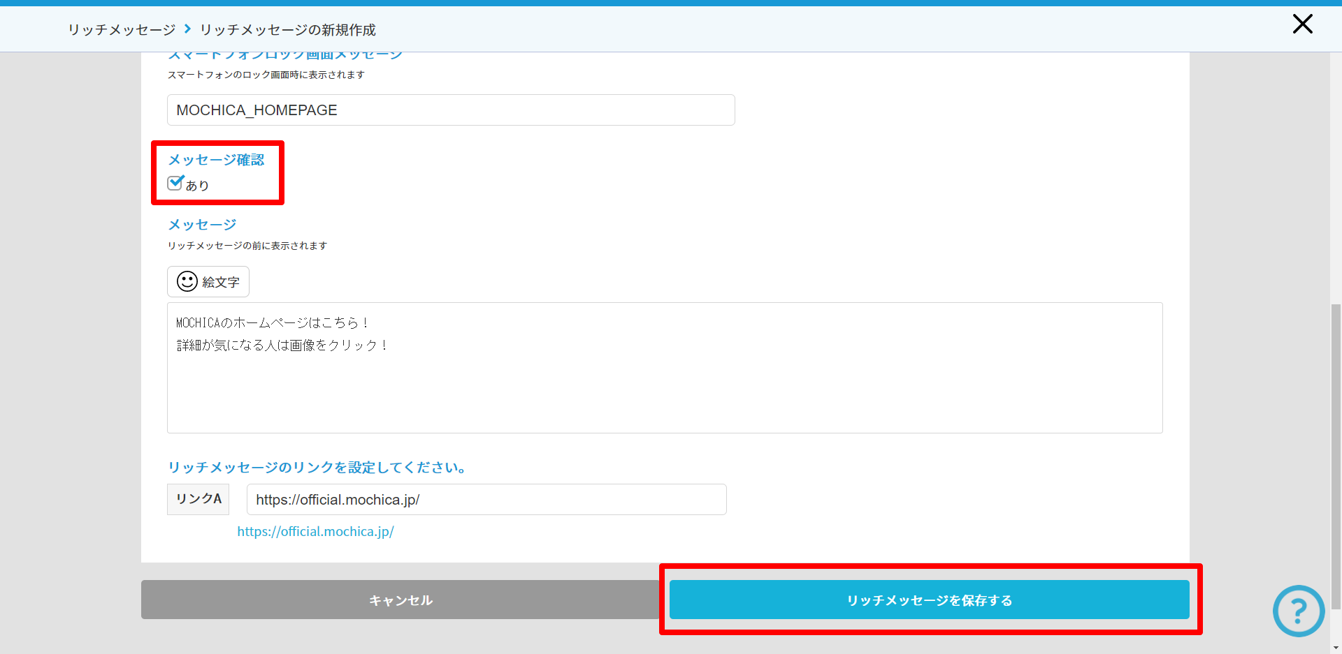 ① リッチメッセージの作成時、メッセージ確認にチェックを入れ有効にする。