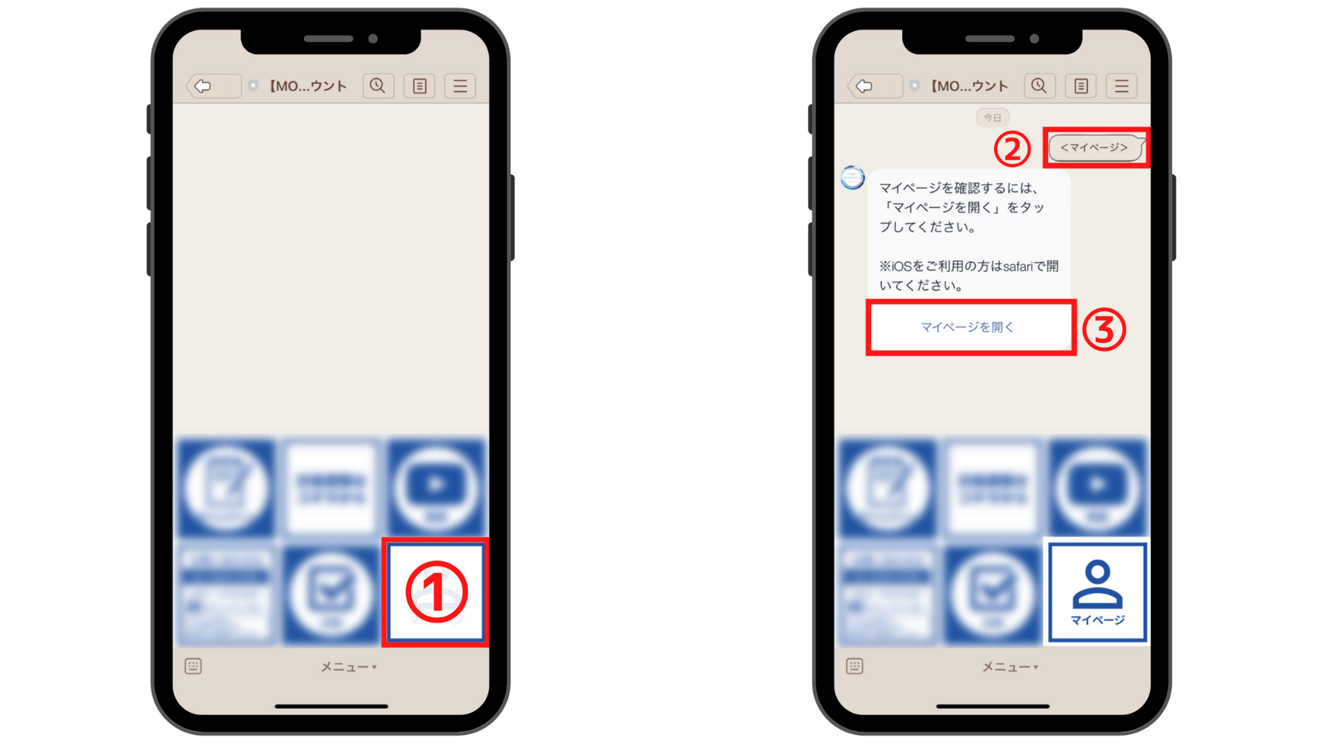 ① リッチメニューに設置したマイページ呼び出し用のボタンをタップする