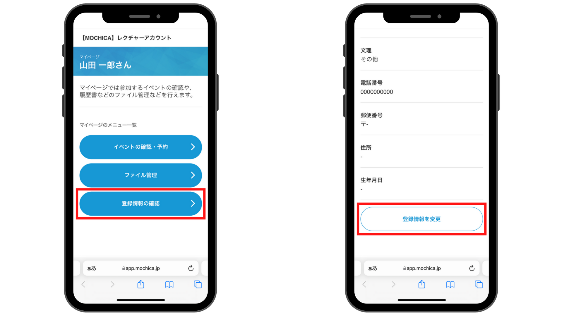 ② 登録情報の変更をタップし変更ができる画面を開く。