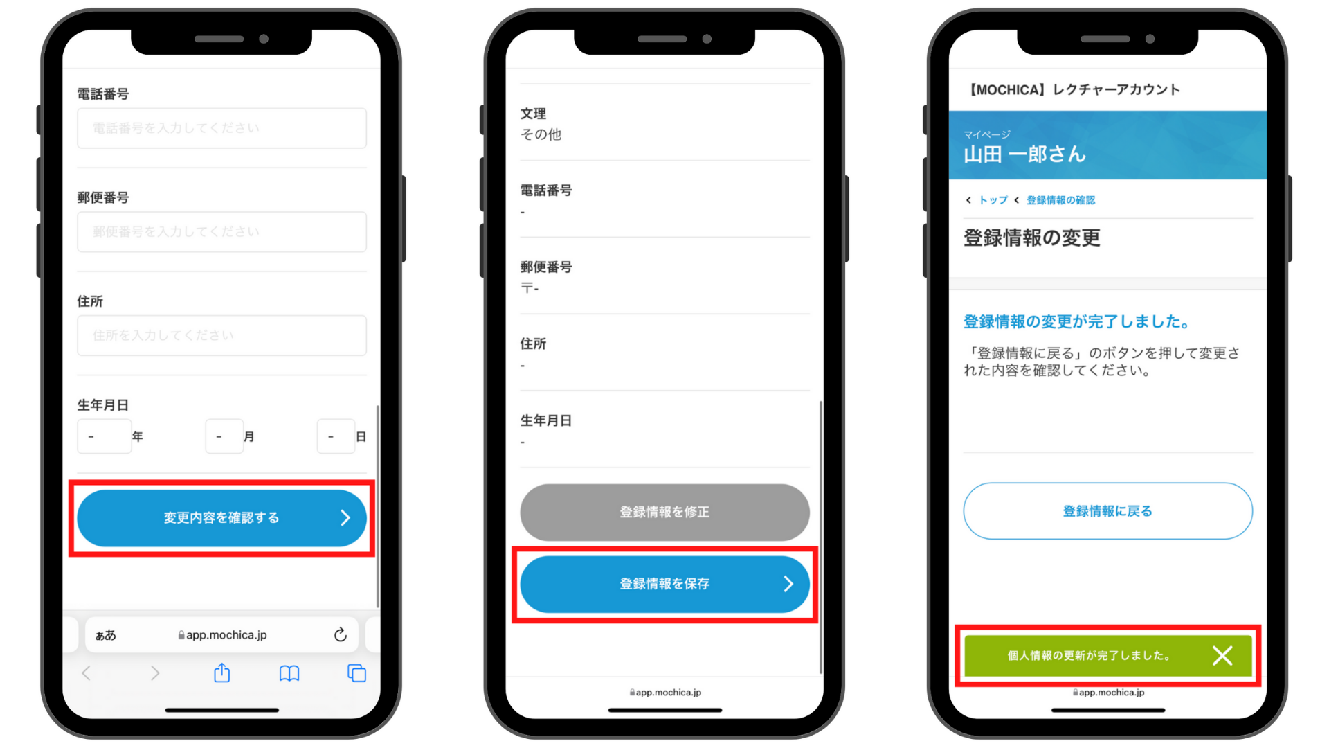 ⑤ 変更が完了すると「個人情報の更新が完了しました」と表示がされます。