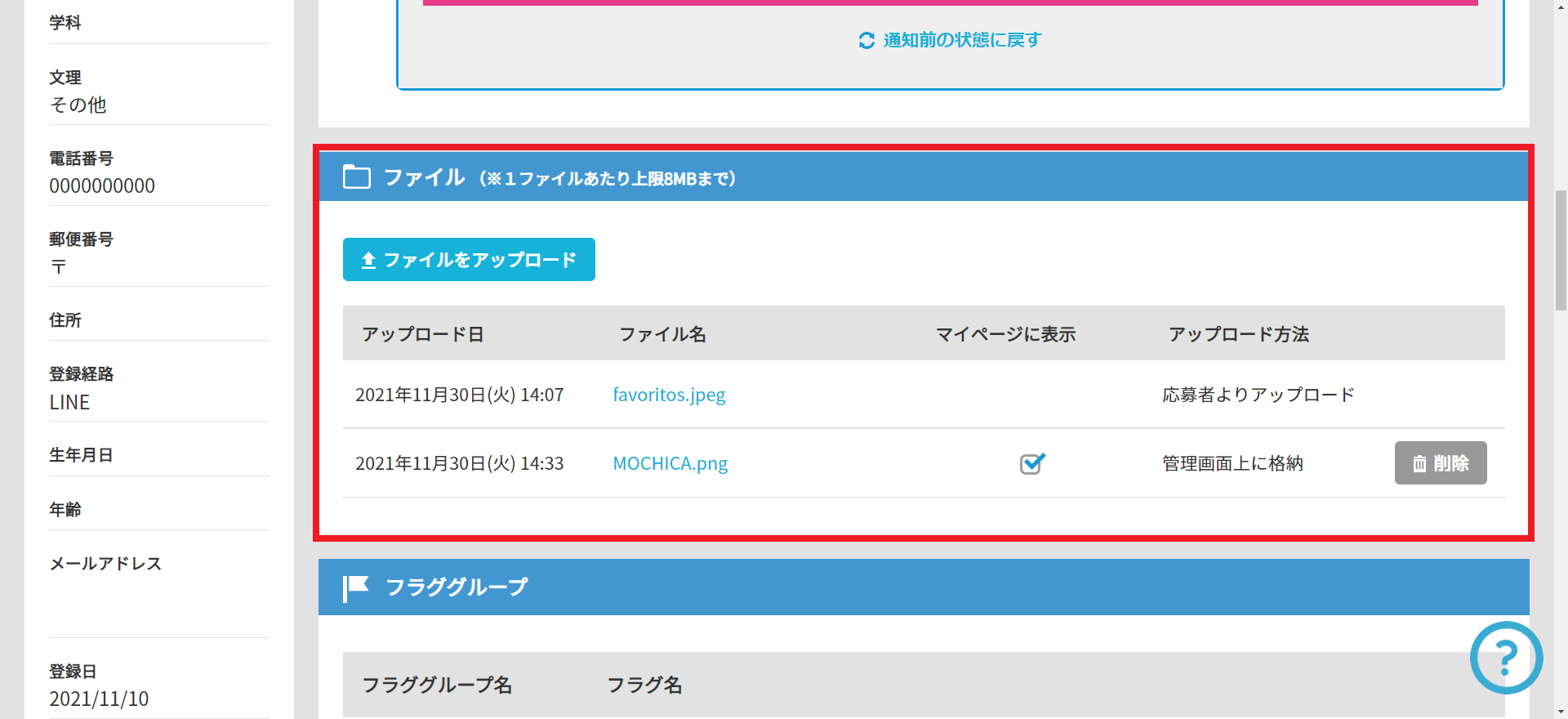 ファイル管理にて受け渡しをした画像は、応募者詳細ページ、ファイルの項目にて一括表示されます。