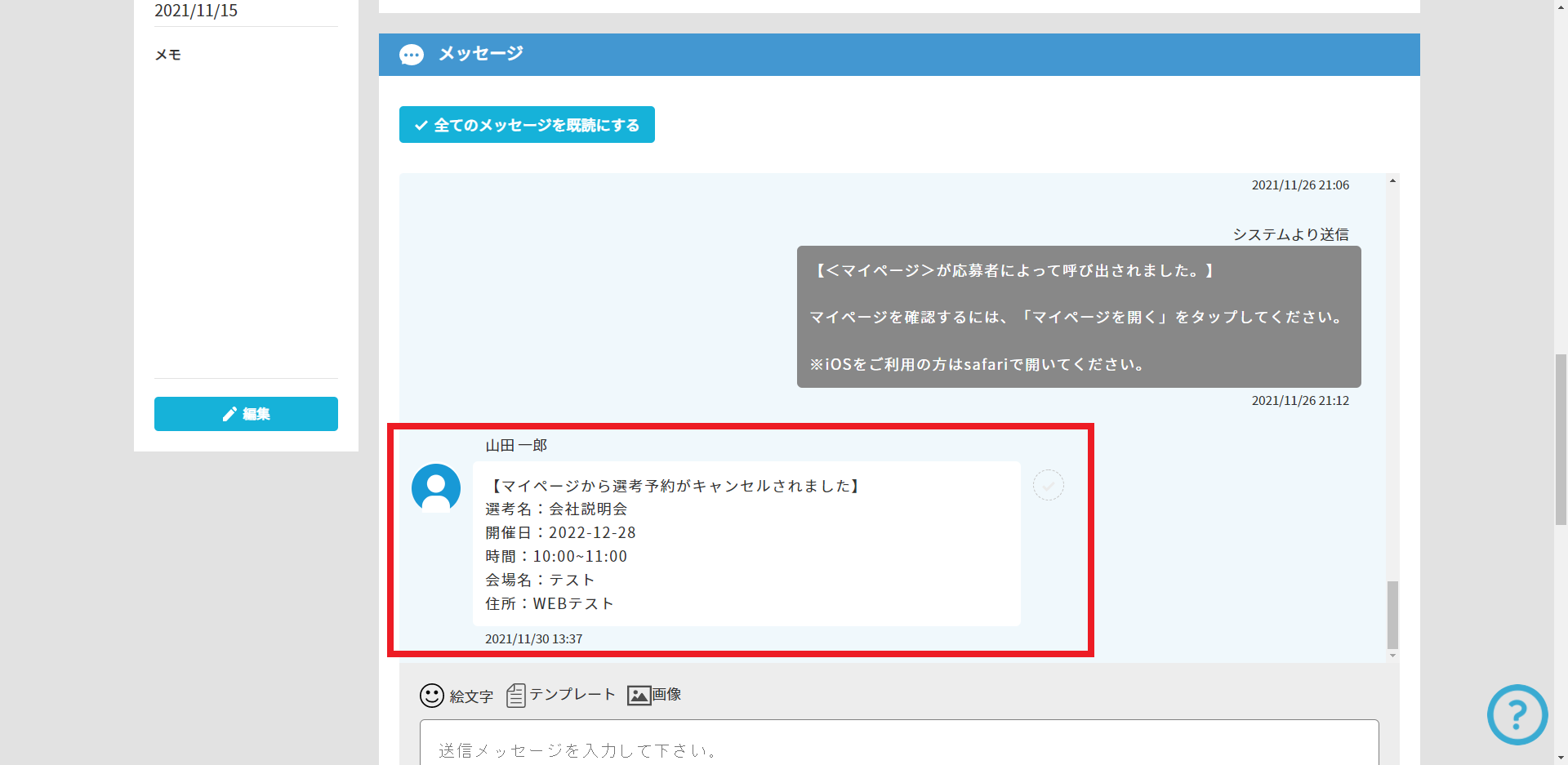MOCHICA管理画面上、応募者詳細のページにてキャンセルされた旨のメッセージが自動送信されます。