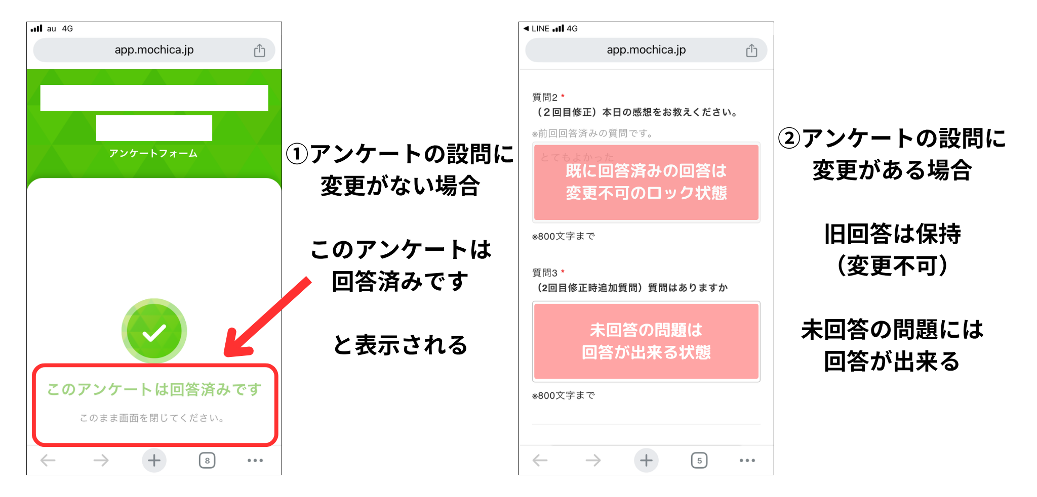 → 旧回答は保持(変更不可)のまま、再度回答画面が起動し未回答の設問には回答できます。