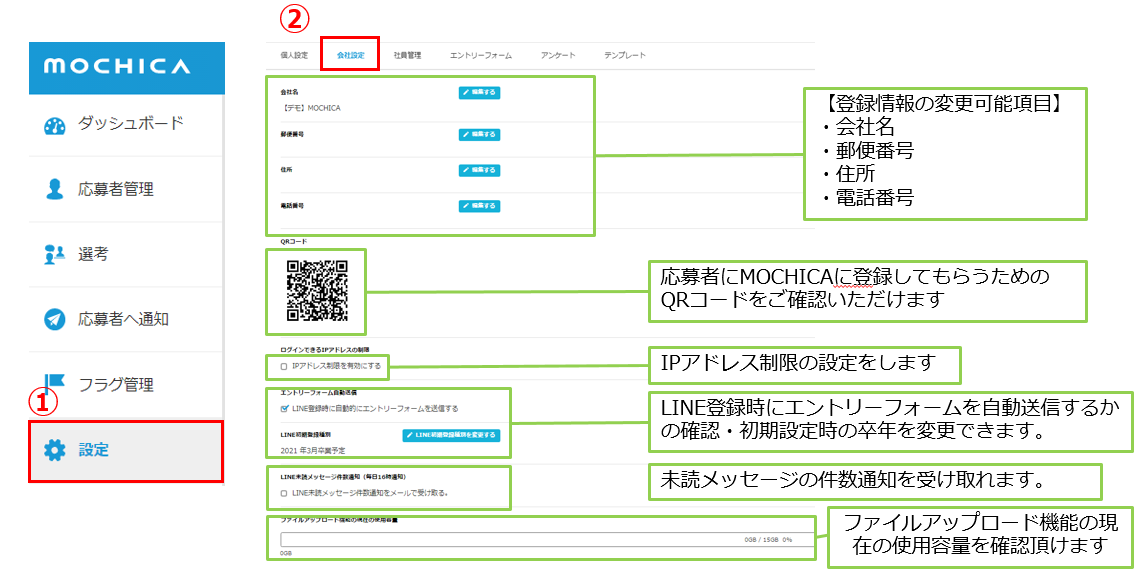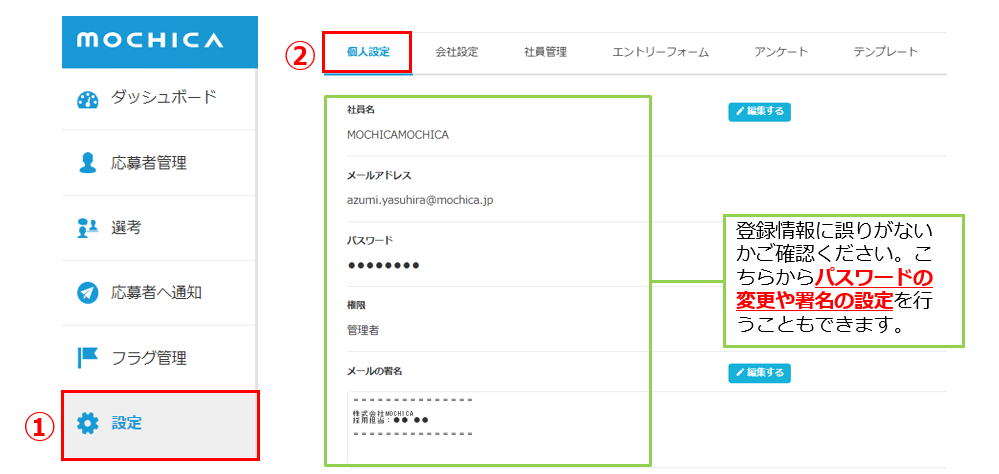 「⚙設定」 からMOCHICAアカウントの基本設定・確認ができます。