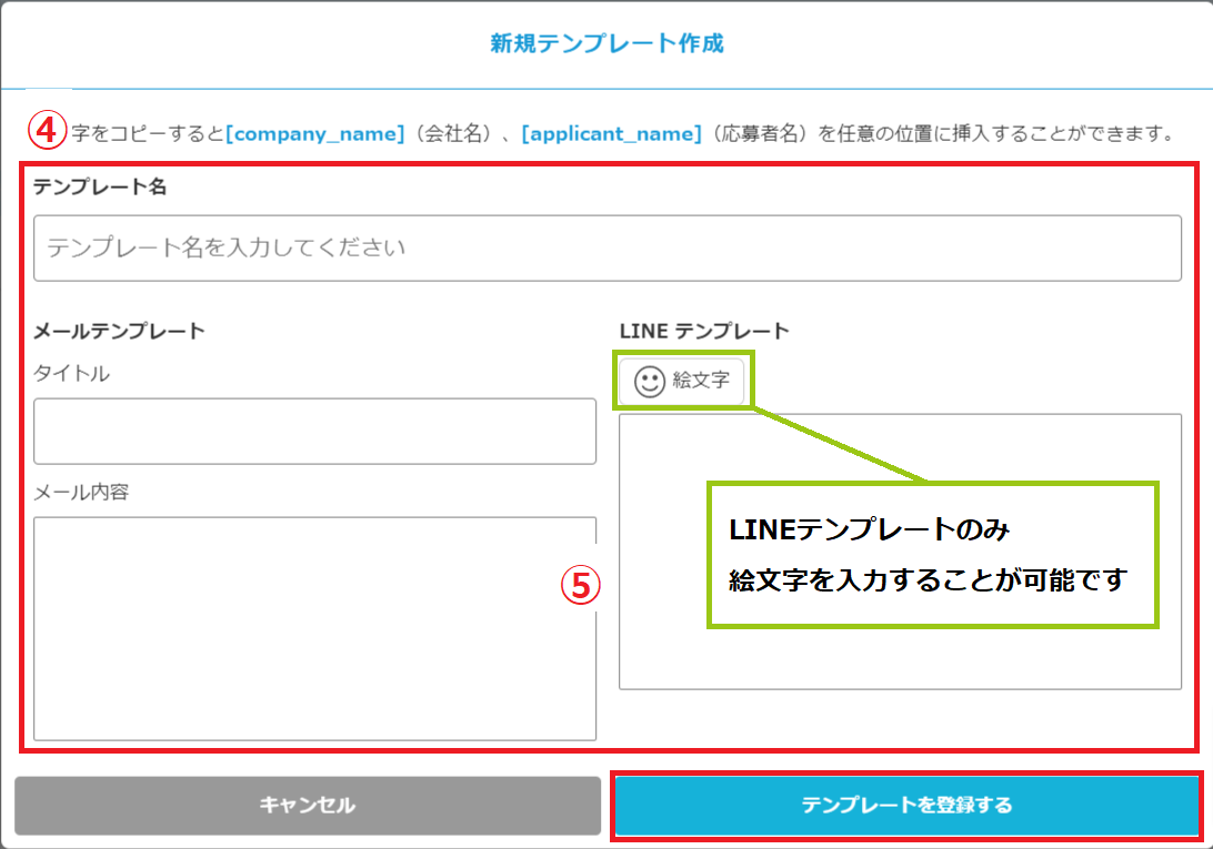 ④テンプレート名、メールテンプレート、LINEテンプレートの文章を入力する