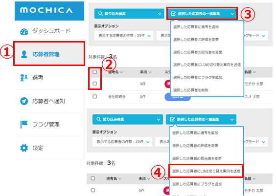 ②「LINE切り替え案内メール」を送信したい応募者に対し、チェックボックスで選択